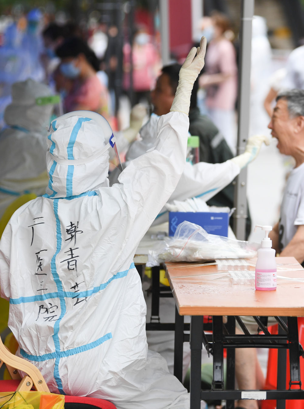 △6月12日,在广州荔湾区白鹤洞街广钢新城,医务人员举手示意居民前来进行核酸检测采样。