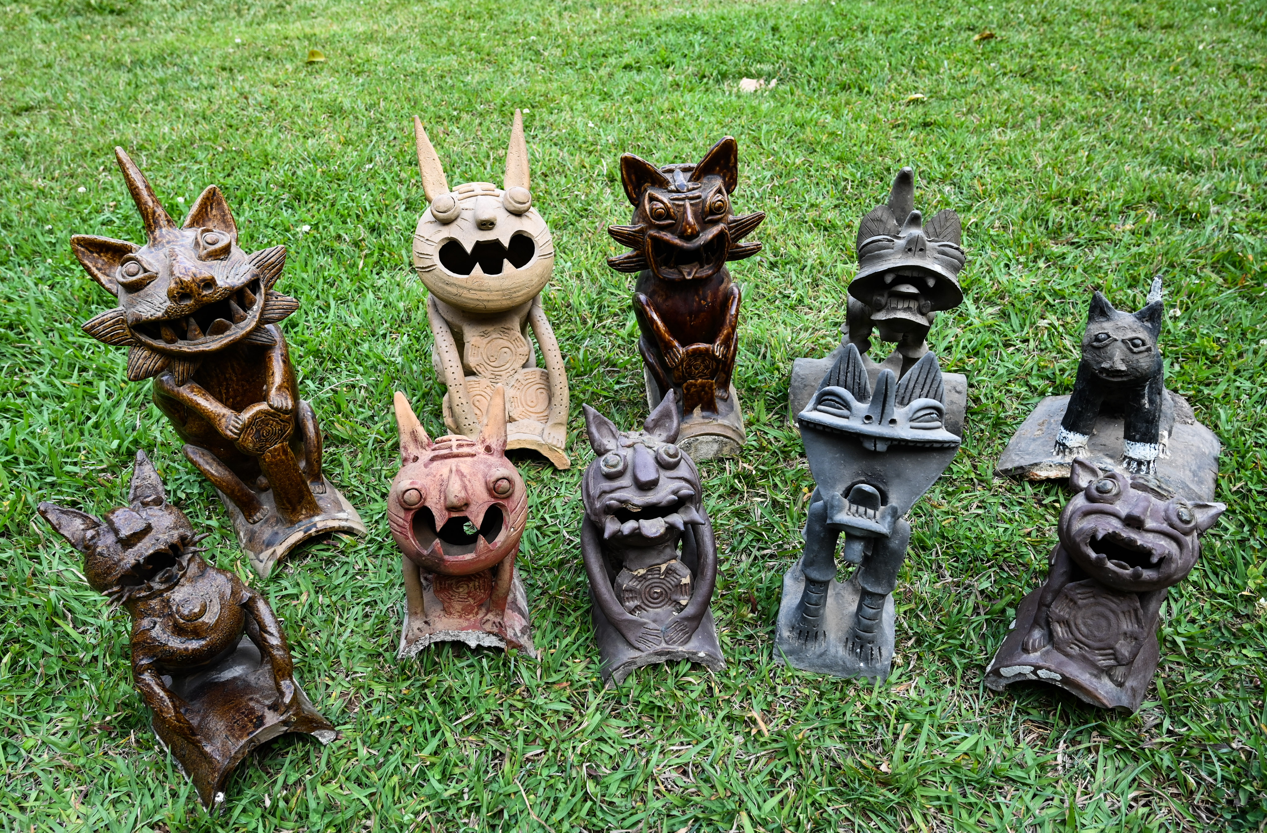 吴松懿介绍,因地区不同,瓦猫的形象有所区别。有人总结,呈贡瓦猫像天真的孩子,玉溪瓦猫像留须的巫师,而鹤庆瓦猫造型夸张,也是最有趣的:眼睛外鼓,耳朵直竖,咧着大嘴,舌头往外伸,露出尖锐的牙齿,且四肢粗壮有力,看上去很凶。