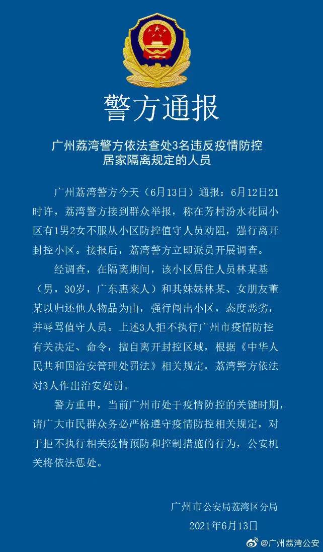 新华社广州6月13日电(记者周颖)广州荔湾警方13日对外通报称,荔湾区三人违反疫情防控居家隔离规定,擅自强行闯出封控小区被治安处罚。