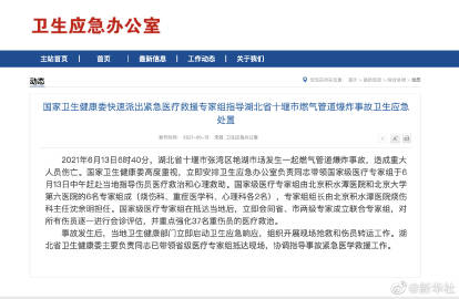 #重点强化37名重伤员医疗救治#【#国家卫健委派出专家组赴湖北十堰#】据国家卫健委官网,2021年6月13日6时40分,湖北省十堰市张湾区艳湖市场发生一起燃气管道爆炸事故,造成重大人员伤亡。国家卫健委13日中午已派出国家级医疗专家组赴湖北省十堰市。国家级医疗专家组由北京积水潭医院和北京大学第六医院的6名专家组成,包括烧伤科、重症医学科、心理科各2名,专家组组长由北京积水潭医院烧伤科主任沈余明担任。国家级医疗专家组抵达当地后,立即会同省、市两级专家成立联合专家组,对所有伤员逐一进行会诊评估,并重点强化37名重伤员的医疗救治。
