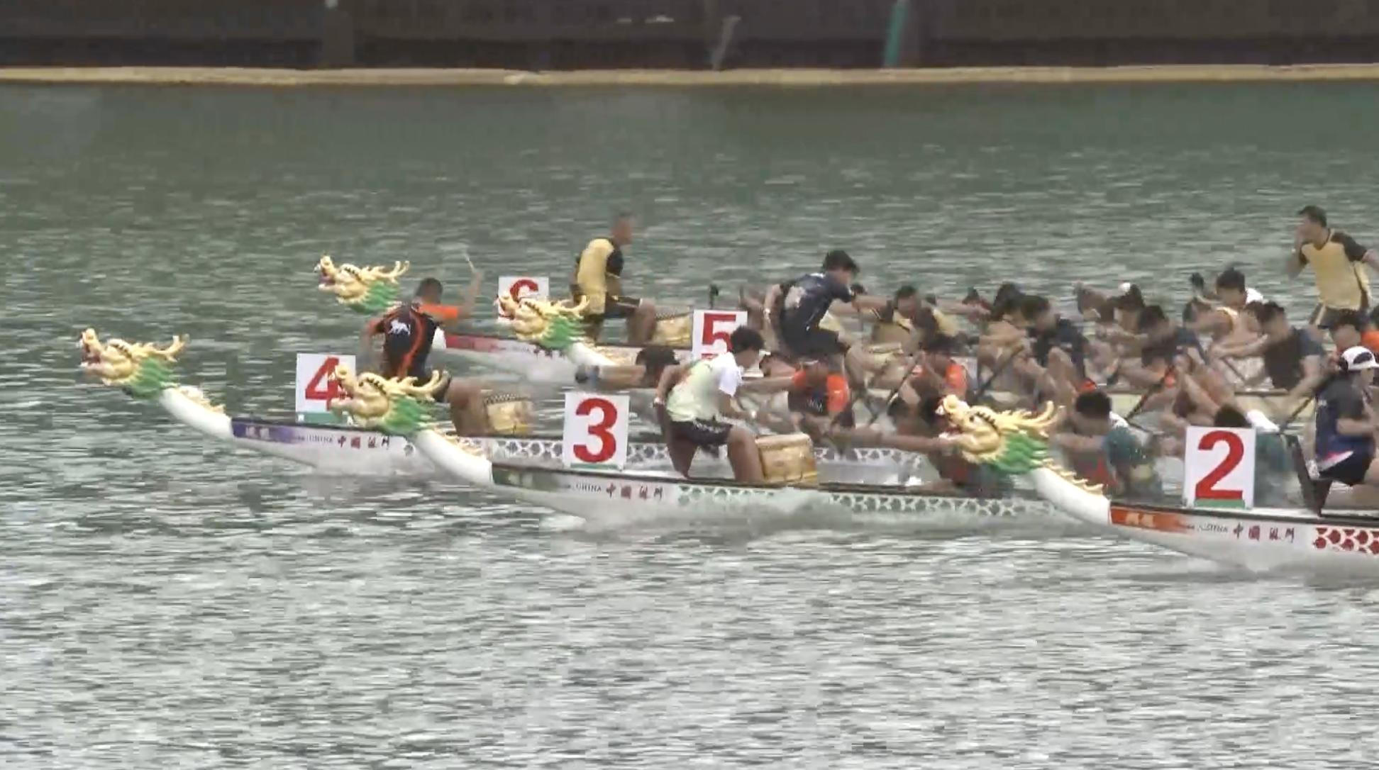 由澳门特区政府体育局和中国澳门龙舟总会举办的2021澳门国际龙舟赛13日在南湾湖水上活动中心鸣锣开赛。129支参赛队伍在水上奋楫争先,为端午佳节增添了浓浓的喜庆氛围。