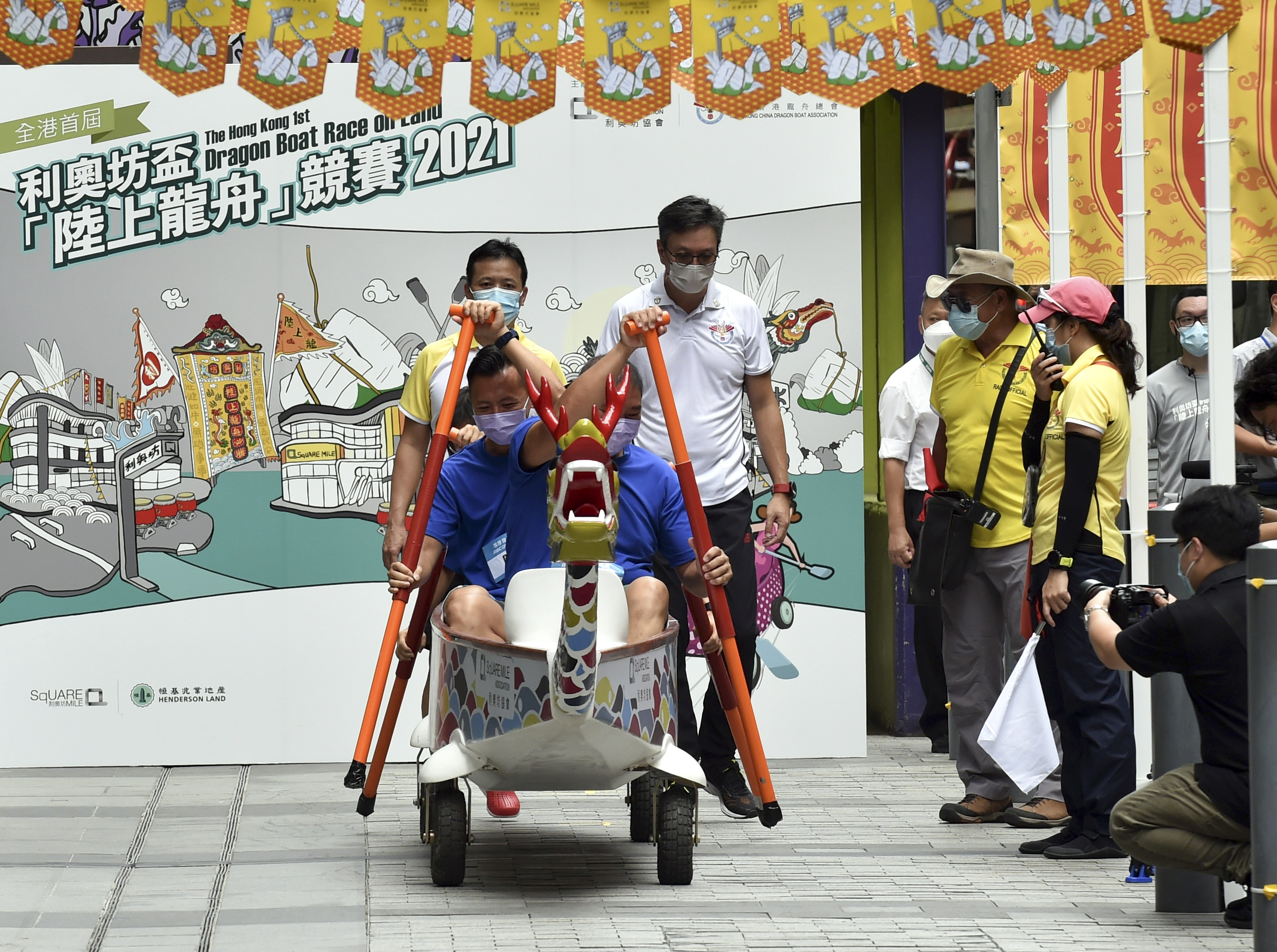 由利奥坊协会主办、中国香港龙舟总会支持的陆上龙舟赛——“利奥坊杯陆上龙舟竞赛2021”13日在西九龙举行。街道上,12支参赛队伍坐进专门为这次竞赛特制的陆上龙舟,同场竞技。