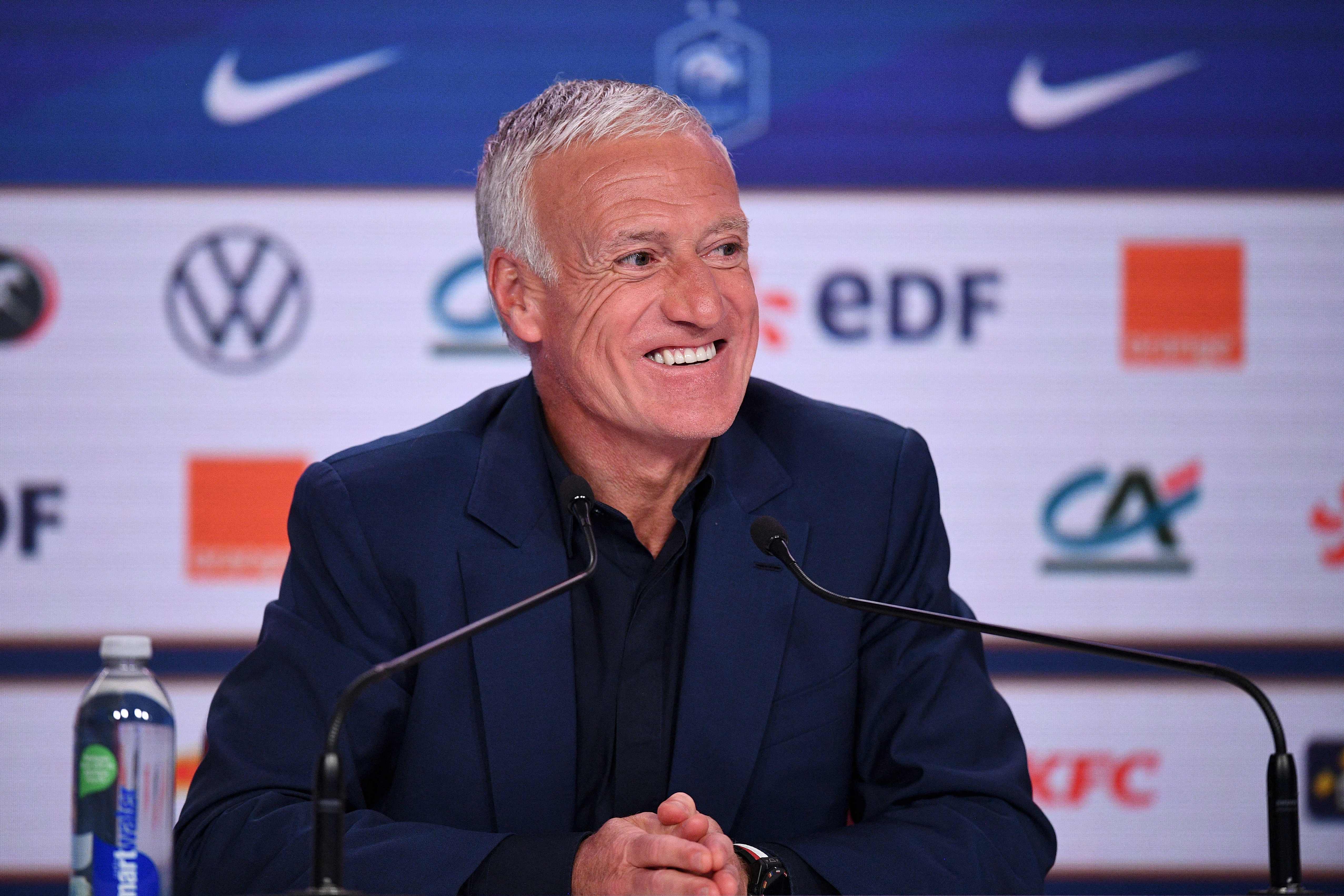 资料图:法国队主教练德尚在发布会上。新华社/法新