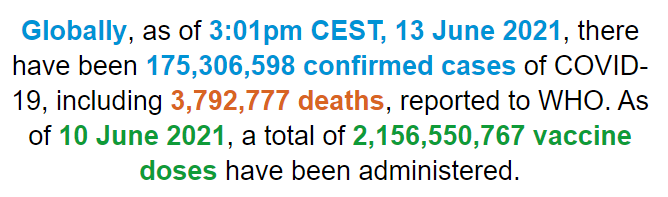 根据世卫组织最新实时统计数据,截至欧洲中部夏令时间6月13日15时01分(北京时间6月13日21时01分),全球累计新冠肺炎确诊病例175306598例,累计死亡病例3792777例。13日全球新冠肺炎确诊病例新增387209例,死亡病例新增10158例。(总台记者 朱赫)