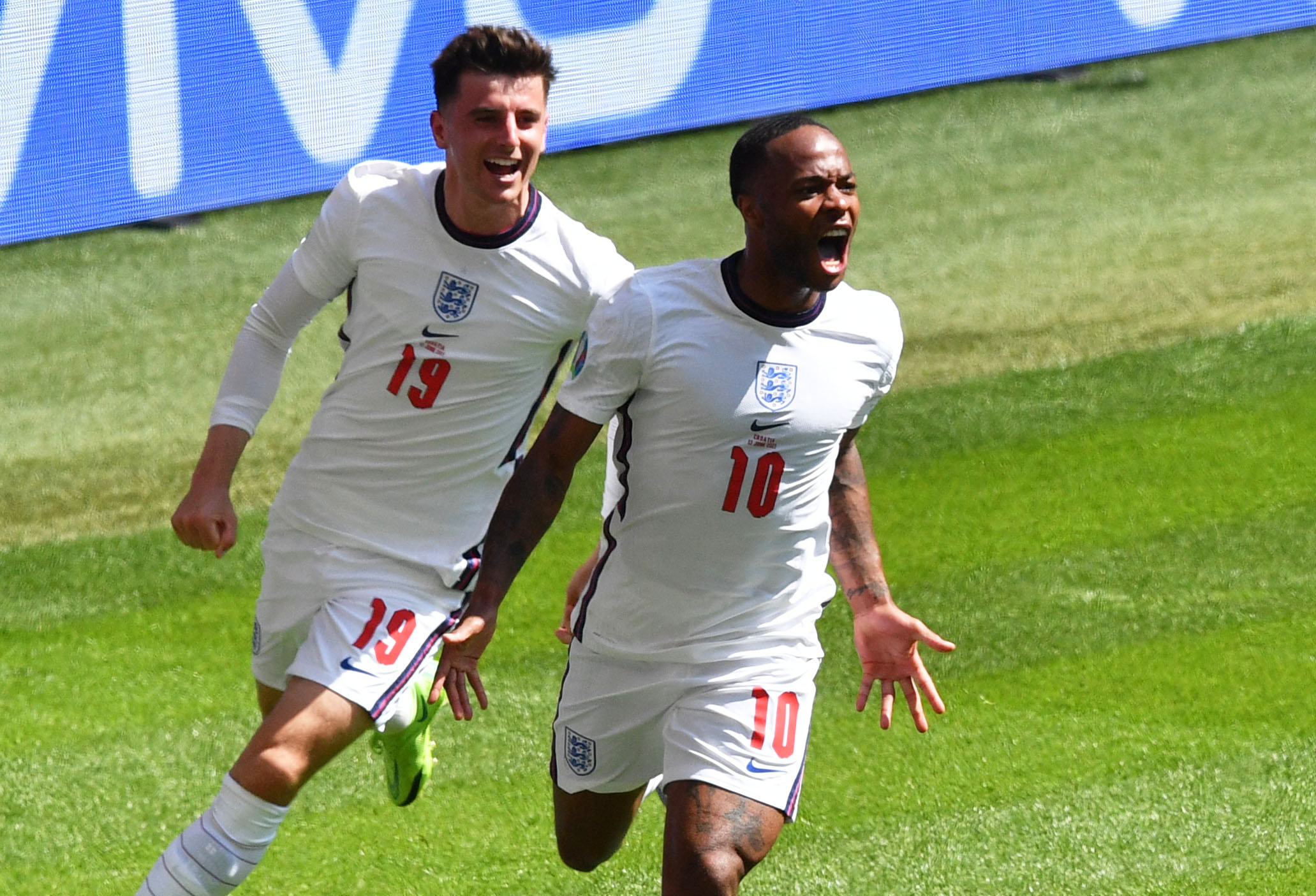 6月13日,英格兰队球员斯特林(右)在比赛中庆祝进球