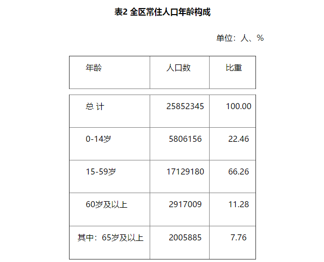 在全区常住人口中,0-14岁[5]人口为5806156人,占22.46%;15-59岁人口为17129180人,占66.26%;60岁及以上人口为2917009人,占11.28%,其中65岁及以上人口为2005885人,占7.76%。