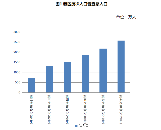 1.总人口:根据第七次全国人口普查结果,2020年11月1日零时全区人口[3]为25852345人,在全国31个省(自治区、直辖市)中,我区的常住人口排名由2010年第六次全国人口普查的第25位上升至第21位。