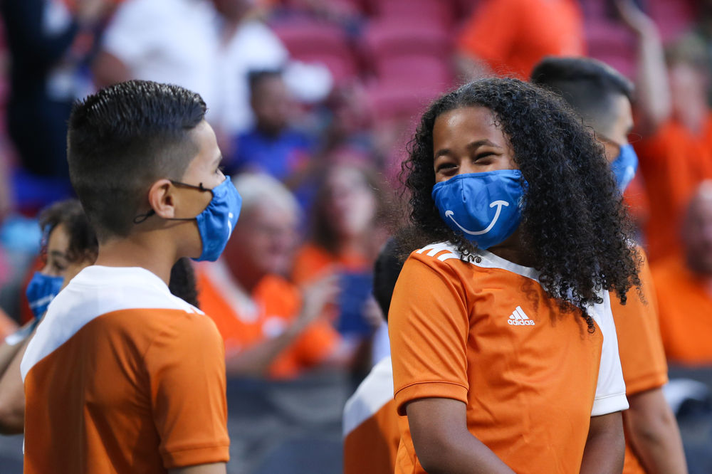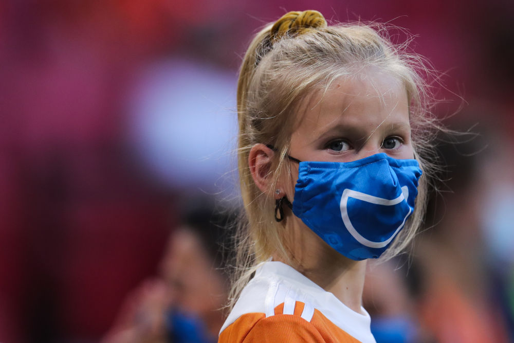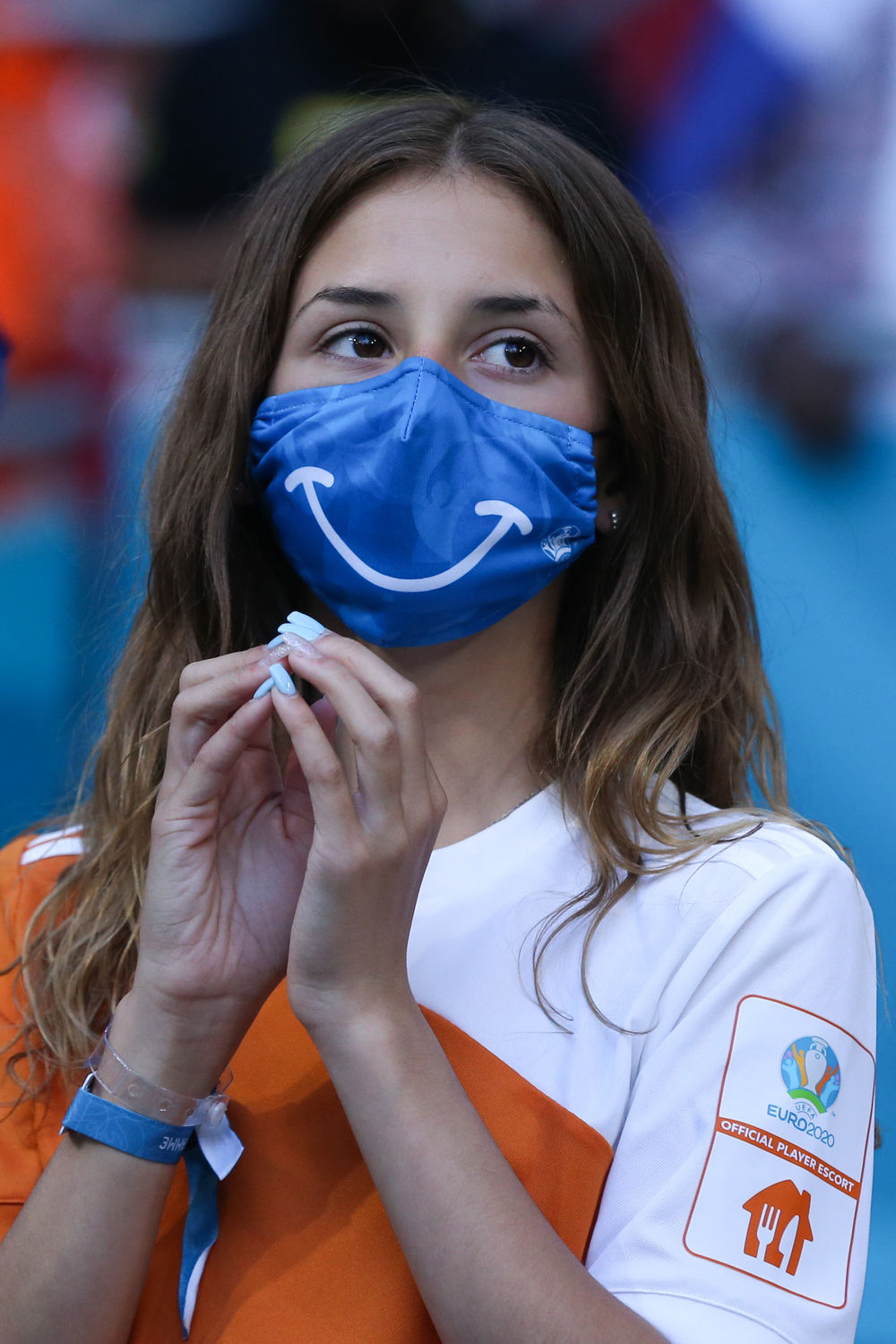 ↑球童戴着“笑脸”口罩亮相球场。