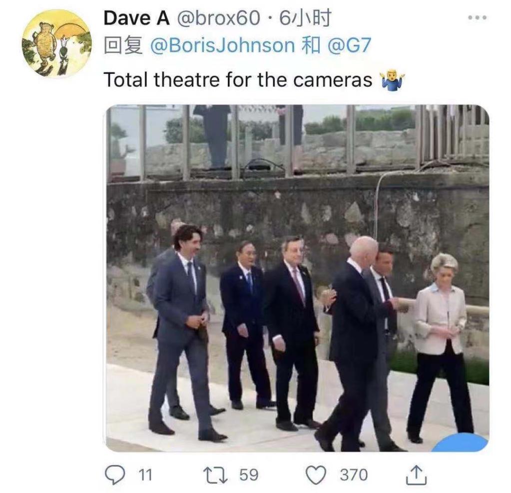 网友留言说:“纯作秀!我猜他们晚餐时很快就会亲亲热热坐在一起吃饭。”“口罩去哪儿了?除了加拿大总理,没人戴口罩。”“美国总统拜登哪天来的英国?10天前吗?那样他才有足够时间隔离。”