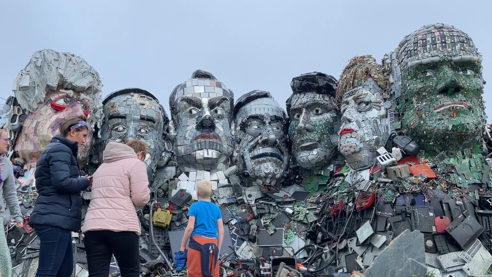 创作者乔·拉什是英国艺术家。他在10多名同行的协助下,用废品堆里翻出来的电子垃圾制成这座“总统山”,意在呼吁七国集团重视电子垃圾对生态环境的负面影响。