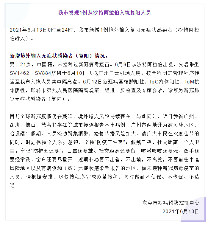 据“东莞疾控”微信公众号消息,2021年6月13日0时至24时,广东东莞新增1例境外输入复阳无症状感染者(沙特阿拉伯输入)。
