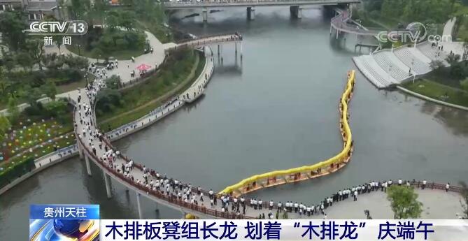 在贵州天柱县,木排长龙的表演吸引了数千人一同观看。柱木排龙是由30节木排和一条板凳长龙组成,全长120米,融合了清水江木排文化、板凳龙文化元素。