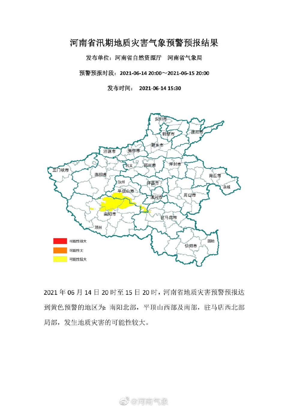 河南省自然资源厅、河南省气象台14日联合发布河南省汛期地质灾害气象预警预报,2021年06月14日20时至15日20时,河南省地质灾害预警预报达到黄色预警的地区为:南阳北部,平顶山西部及南部,驻马店西北部局部,发生地质灾害的可能性较大。请注意防范!