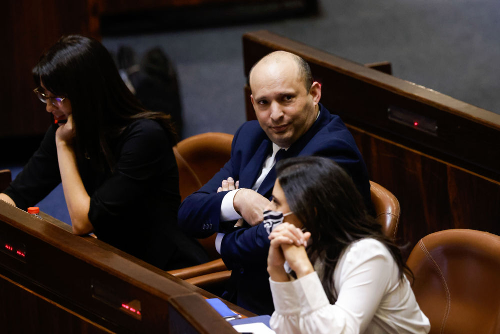 6月13日,纳夫塔利·贝内特(中)在位于耶路撒冷的以色列议会出席就新一届政府组建方案进行投票的特别会议。(新华社/基尼图片社)