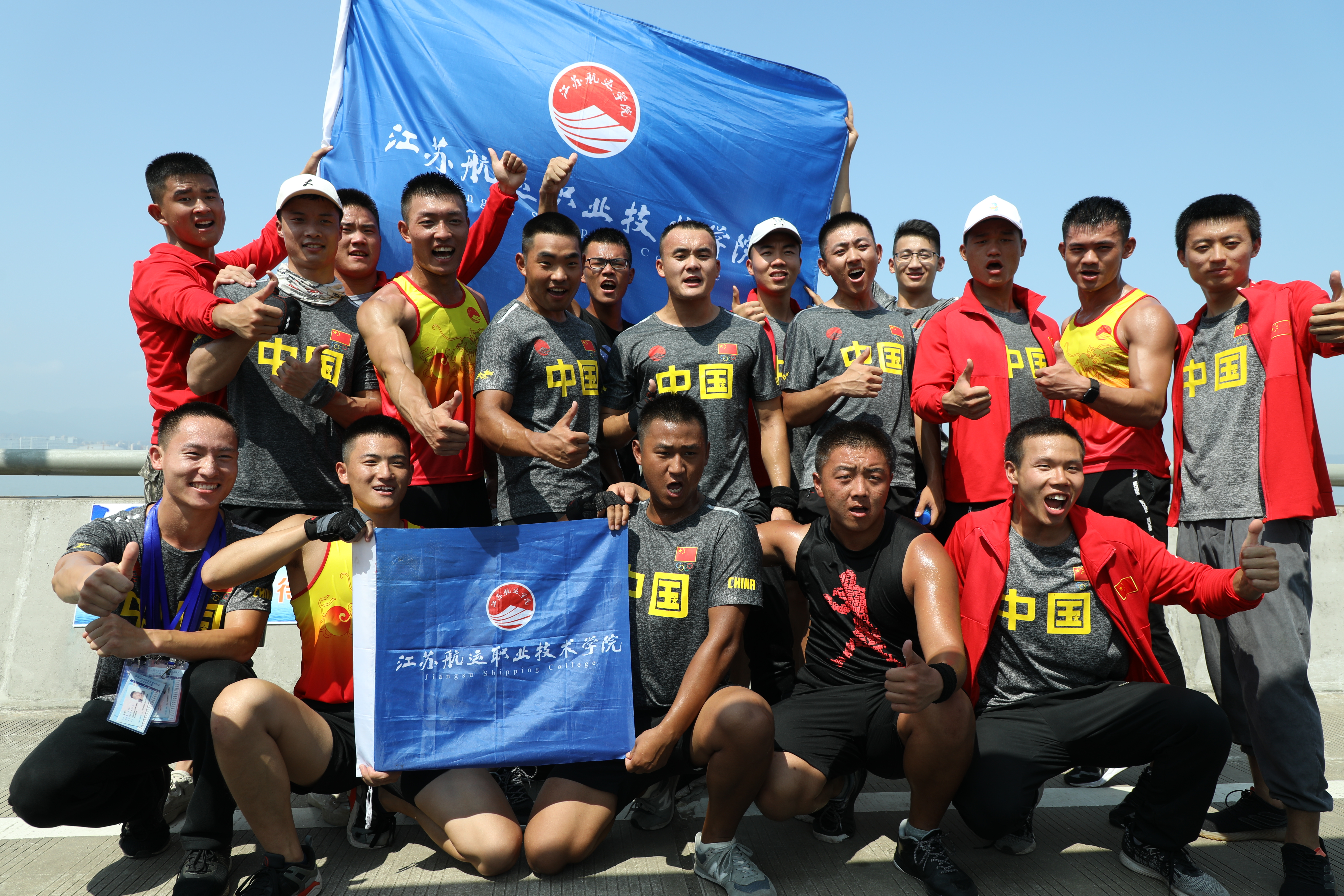 2019年6月28日,浙江舟山,闫超动(后排左五)和同学们代表江苏航运职业技术学院在第五届中国海员技能大比武上获得团体一等奖,这是该校参赛队员合影。受访者闫超动供图
