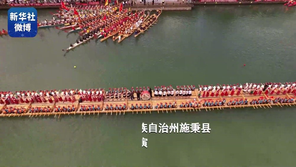 【场面壮观!#世界最长木龙舟游江过端午#】端午期间,贵州省黔东南苗族侗族自治州施秉县举行#世界最长木龙舟展演#,由200名身着苗衣的姑娘手持划桨,载着120名身穿民族盛装人员,在98.8米的木龙舟上游江展演,30多支参赛龙舟队及独木龙舟跟随着大龙舟在舞阳河施秉县城段巡游。(记者刘勤兵、蒋成) 新华社的微博视频