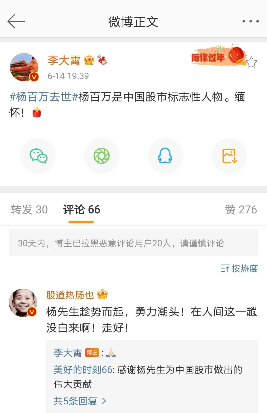 6月14日杨怀定去世消息一出,引发了众多证券从业人士的关注。英大证券首席经济学家李大霄发布微博表示:“杨百万是中国股市标志性人物。缅怀!”