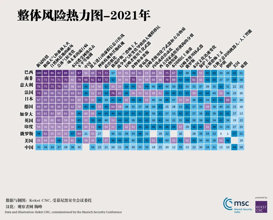 拿今年指数中最重要的一项风险源——“新冠疫情”来说,凭借出色的防疫措施,中国民众的感知指数仅有35。国内疫情防控一团乱麻的巴西感知指数最高,达到100分。此外,意大利76、日本67、加拿大和英国62。值得一提的是,累计感染人数居全球第一、第二的美国和印度,民众对疫情的感知指数不高,分别为55和59。