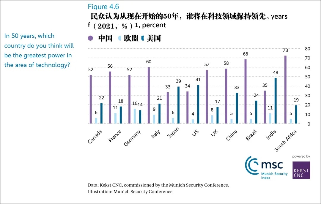 南非有73%的受访者认为中国会在科技领域遥遥领先。即便是法国、德国和意大利等欧盟国家,选择中国的受访者数量也远远超过选择欧盟的。