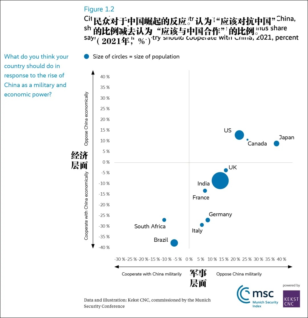 中国无疑成为慕指的“主角”。当然也少不了老生常谈的话题——“民众对于中国崛起的反应”。经济层面,用“认为应该对抗中国”的比例减去“认为应该与中国合作”的比例,结果为正数的是美国、加拿大、日本;军事层面则更多。