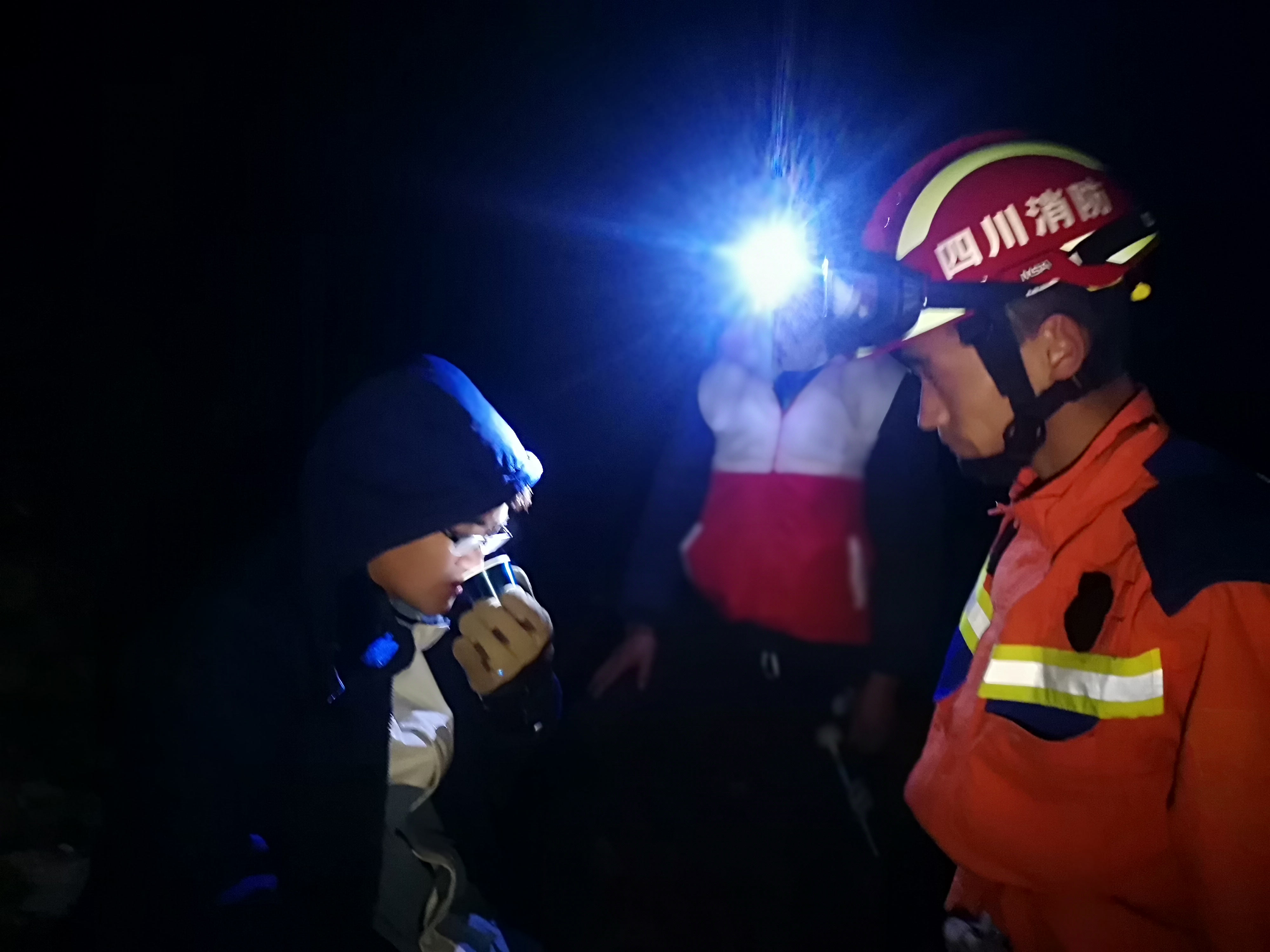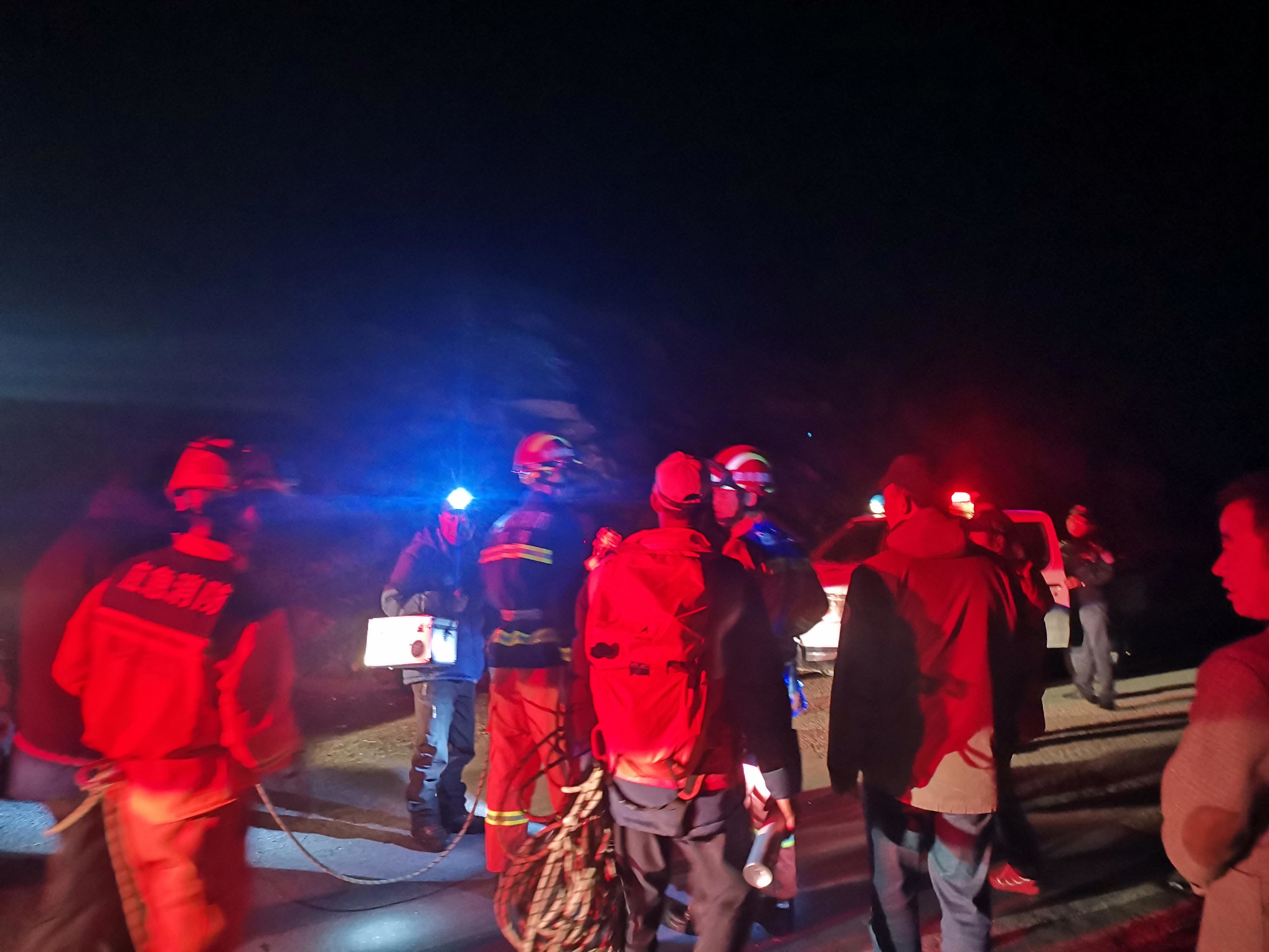 由于夜晚视线不佳、山体陡峭,大部分山体处于未开发状态、杂草从生,山路悬崖多,土质松软,随时伴随有落石,这给消防救援工作带来了相当大的难度和危险,全体救援人员手脚并用艰难前进,经过近两小时左右的紧张搜寻,成功找到被困人员。被困人员意识清醒,但体温较低还出现高原反应,救援人员立即拿出随身带的大衣为被困人员披上,并不停搓揉被困人员双手以及喂食热的葡萄糖水,为其取暖充能。
