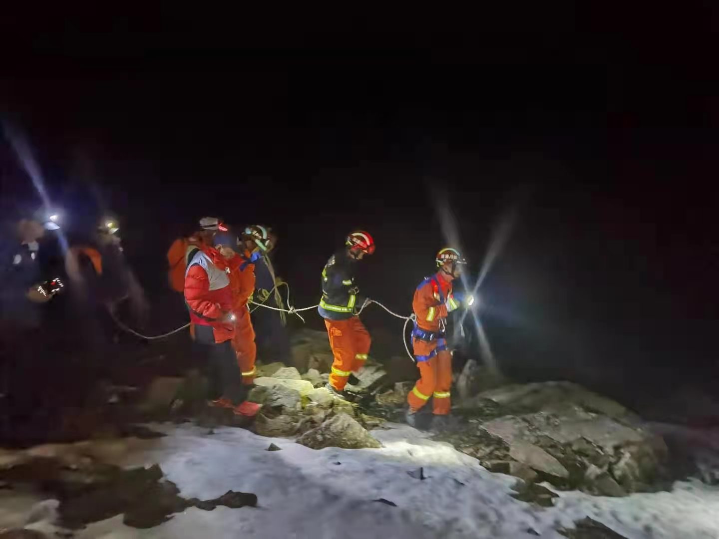 22时50分,消防站救援人员到达巴郎山垭口山脚下,现场视线不佳且伴有大雾,在与地方景区管理人员取得联系后,与景区工作人员一起进行搜寻救援。在确定被困人员的大概位置后,救援人员立即携带照明、救援等装备在景区向导的引导下“爬行”超过55度的山体对被困人员进行搜寻救援。