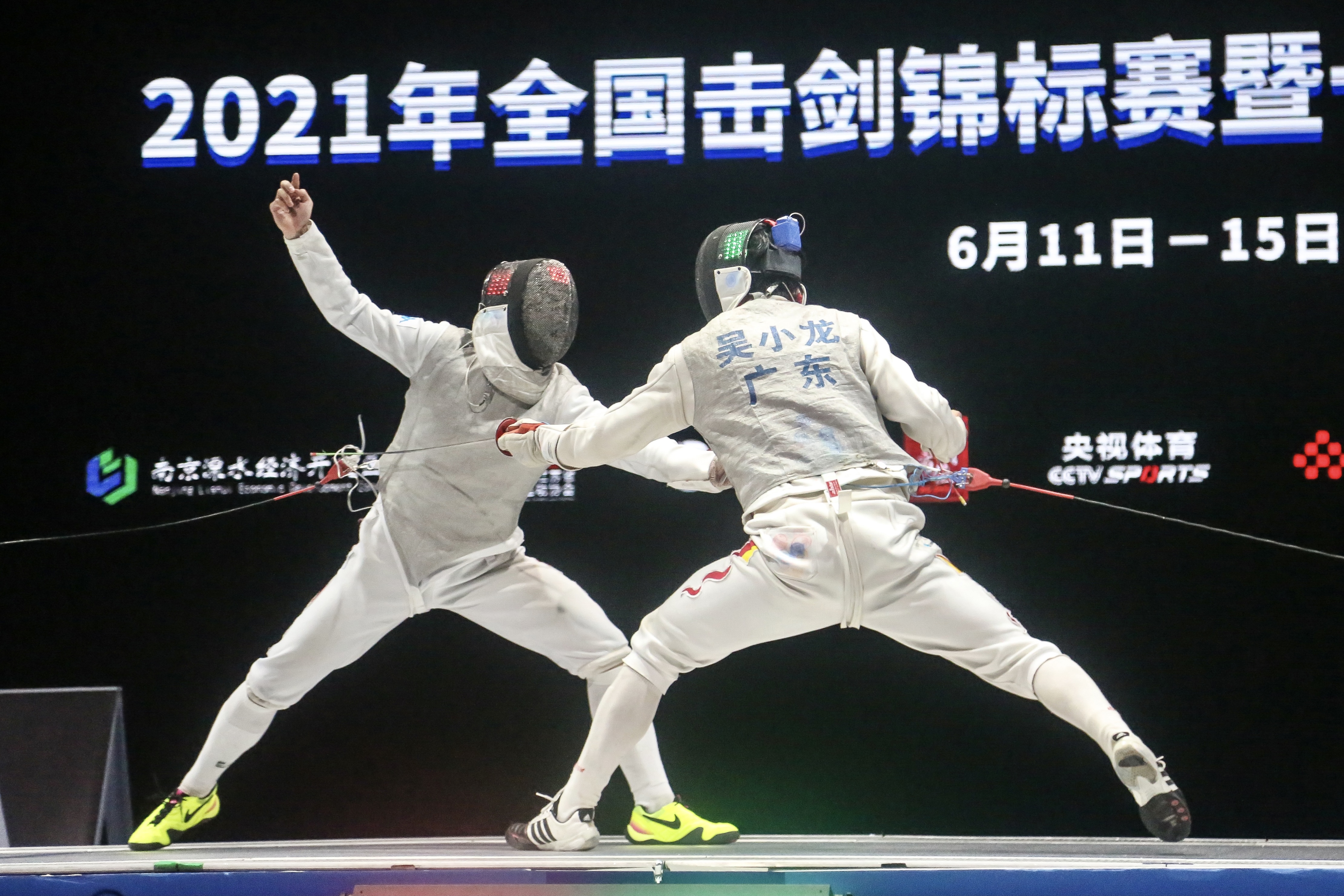 黄梦恺(左)和广东队选手马建飞在比赛中试剑