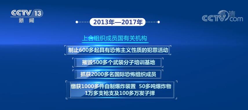 据不完全统计,仅在2013年—2017年的四年时间里,上合组织成员国有关机构共制止600多起具有恐怖主义性质的犯罪活动,摧毁500多个武装分子培训基地,抓获2000多名国际恐怖组织成员,缴获1000多件自制爆炸装置、50多吨爆炸物、1万多支枪支及100多万发子弹。2016年—2017年,成员国共屏蔽10万多家网站,这些网站共登载400多万条宣扬恐怖主义和极端主义的信息。