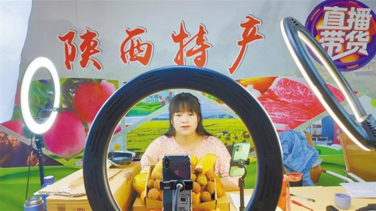 在武功县抖音电商生鲜和食品直播基地,主播正在进行直播。