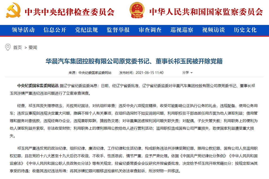 据辽宁省纪委监委消息:日前,经辽宁省委批准,辽宁省纪委监委对华晨汽车集团控股有限公司原党委书记、董事长祁玉民涉嫌严重违纪违法问题进行了立案审查调查。