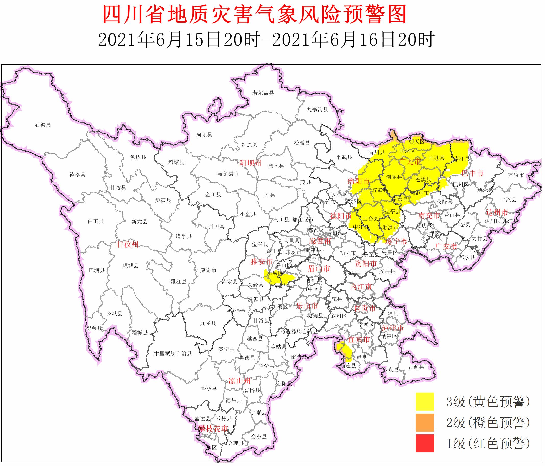结合四川省气象台天气预报情况,四川省地质灾害指挥部办公室今天(15日)17时发布消息,6月15日20时—6月16日20时,四川省地质灾害气象风险3级黄色预警区域为预警区域:广元利州区、朝天区、旺苍县、青川县、昭化区、剑阁县、苍溪县,绵阳盐亭县、平武县、涪城区、三台县、梓潼县、江油市、游仙区,德阳中江县、罗江县,巴中南江县、恩阳区,南充阆中市、南部县,遂宁射洪县、大英县,雅安荥经县、天全县、雨城区,眉山洪雅县,宜宾叙州区、高县、珙县、筠连县。