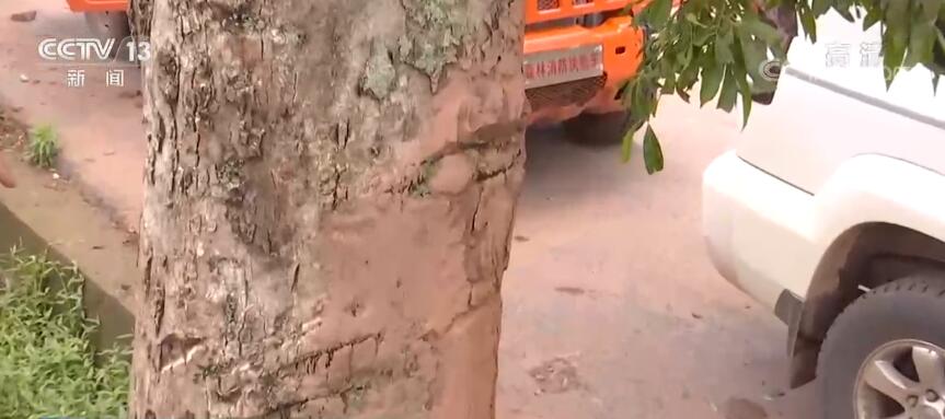 总台央视记者:昨天,象群就到了这里,其实我们很远处就闻到了非常浓重的大象的味道 大家看这一片 这个脚印就是大象留下来的 这片苞米都被它吃完了。再给大家看一下这个地方,就是旁边是一棵树。专家告诉我们这很可能是大象蹭痒留下的痕迹,我们可以近距离看一下。