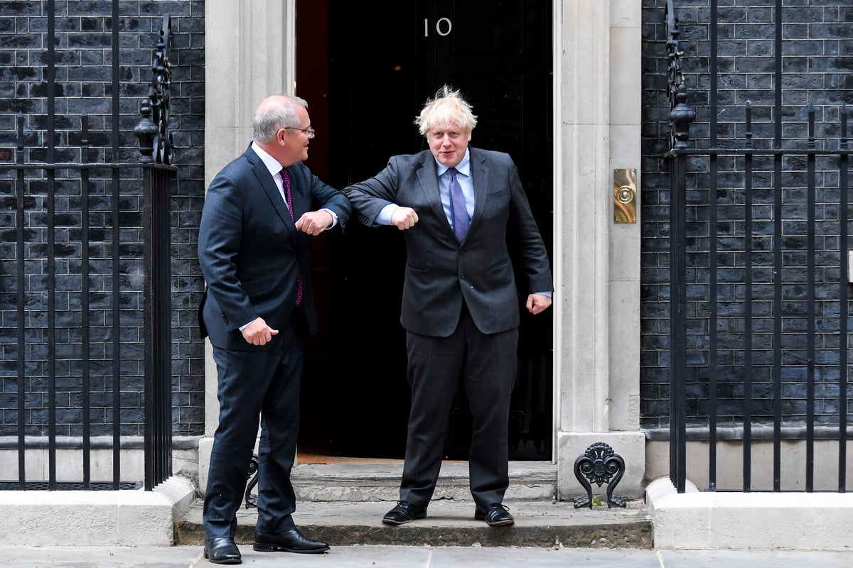 △英国首相约翰逊与澳大利亚总理莫里森在英国首相府前(图片来自英国《独立报》)
