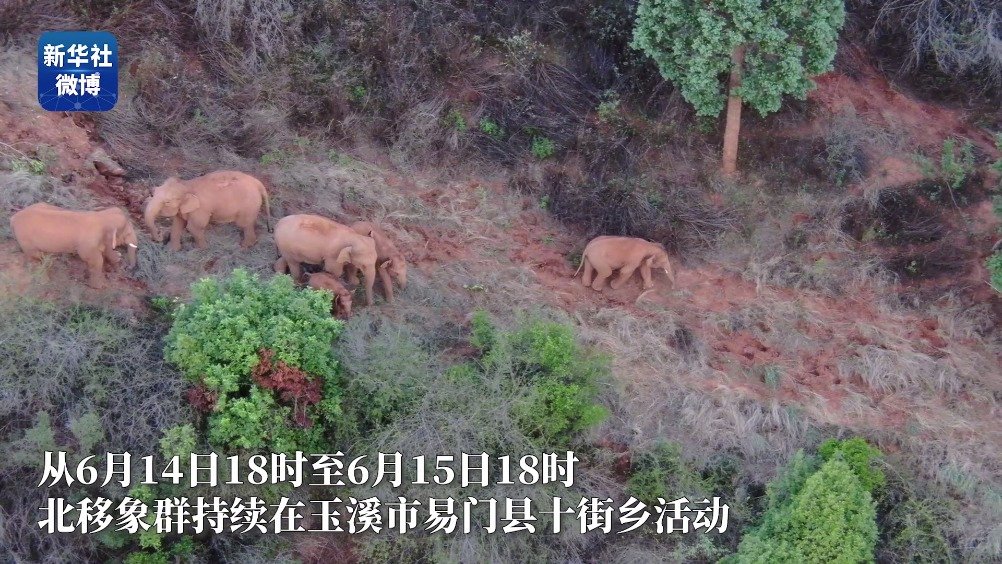 #15头象均在监测范围# 【#云南北移亚洲象群向西北小范围移动#】记者从云南北移亚洲象群安全防范工作省级指挥部了解到,从6月14日18时至6月15日18时,北移象群持续在玉溪市易门县十街乡活动,向西北方向迂回迁移9公里,移动直线距离1.3公里。独象离群10天,位于象群东偏北方向,与象群直线距离19.1公里,持续在昆明市晋宁区双河彝族乡活动。15头象均在监测范围内,整体平稳,人象平安。(记者孙敏、赵珮然、胡超) 新华社的微博视频