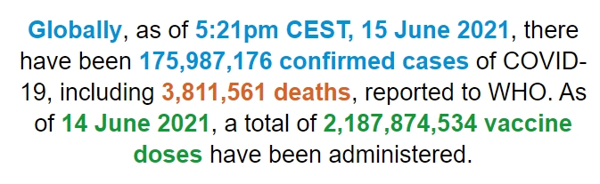 根据世卫组织最新实时统计数据,截至欧洲中部夏令时间6月15日17时21分(北京时间6月15日23时21分),全球累计新冠肺炎确诊病例175987176例,累计死亡病例3811561例。15日全球新冠肺炎确诊病例新增283487例,死亡病例新增7814例。(总台记者 朱赫)