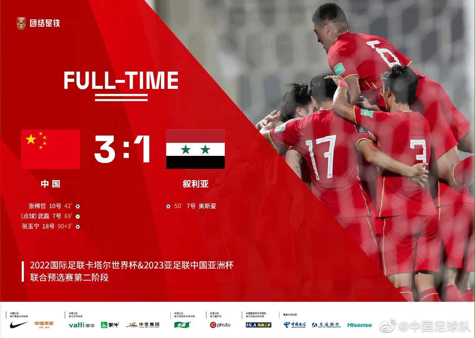 下半场,第50分钟,叙利亚队阿奥斯曼利用国足后防传球失误,在禁区内接队友回传推射入网,迅速扳平比分。第69分钟,武磊在前场断球后突入禁区被对方门将绊倒获得点球,他自己主罚命中,中国队2:1再次领先。补时阶段,尹鸿博右路下底传中,张玉宁中路接应推射入网,为国足3:1锁定胜局。