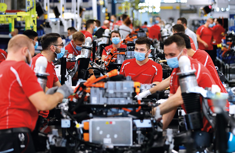 2020年5月12日,德国斯图加特的保时捷汽车工厂,戴口罩的工人在Taycan电动跑车组装线上工作