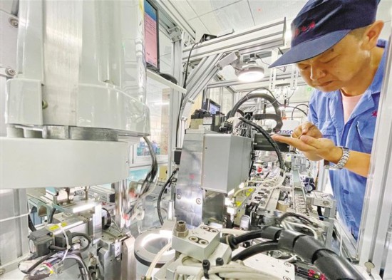 6月4日,陕西电子信息集团西京电气所属宏星电器公司的工人在自动化生产线上检查产品外观。本报记者 戴吉坤摄