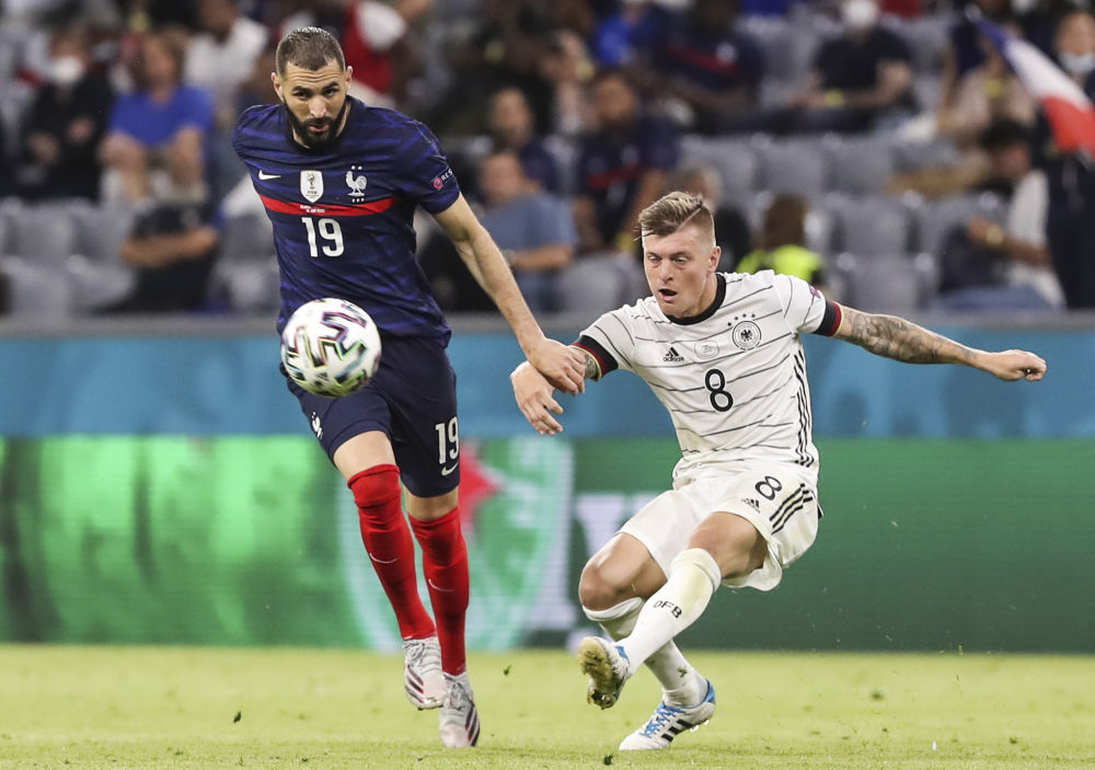 ⬆️法国队球员本泽马(左)与德国队球员克罗斯在比赛中拼抢。