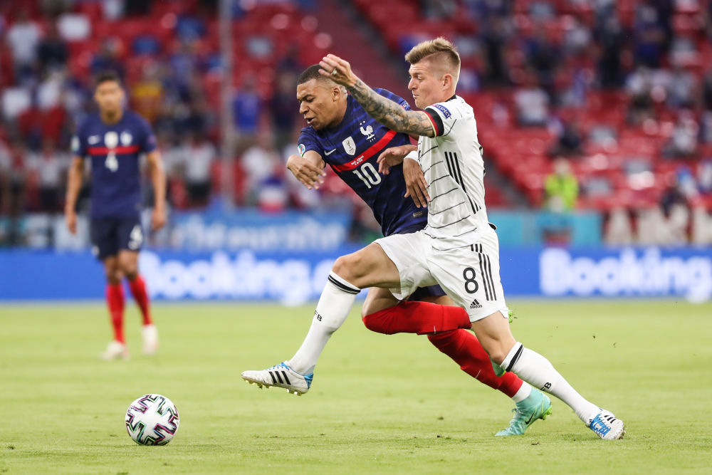 ⬆️法国队球员姆巴佩(左)与德国队球员克罗斯在比赛中拼抢。