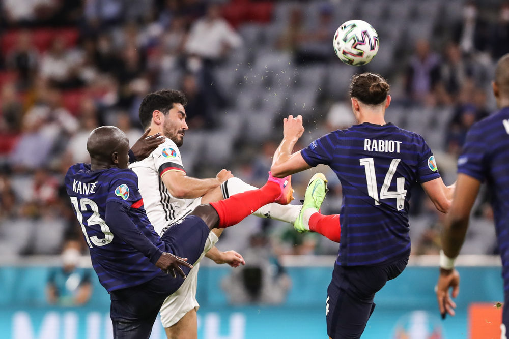 ⬆️德国队球员京多安(中)与法国队球员坎特(左)、拉比奥在比赛中拼抢。