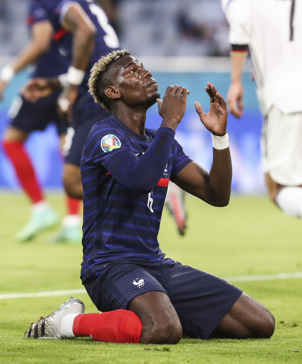 ⬆️法国队球员博格巴在比赛中错失得分机会后懊悔。