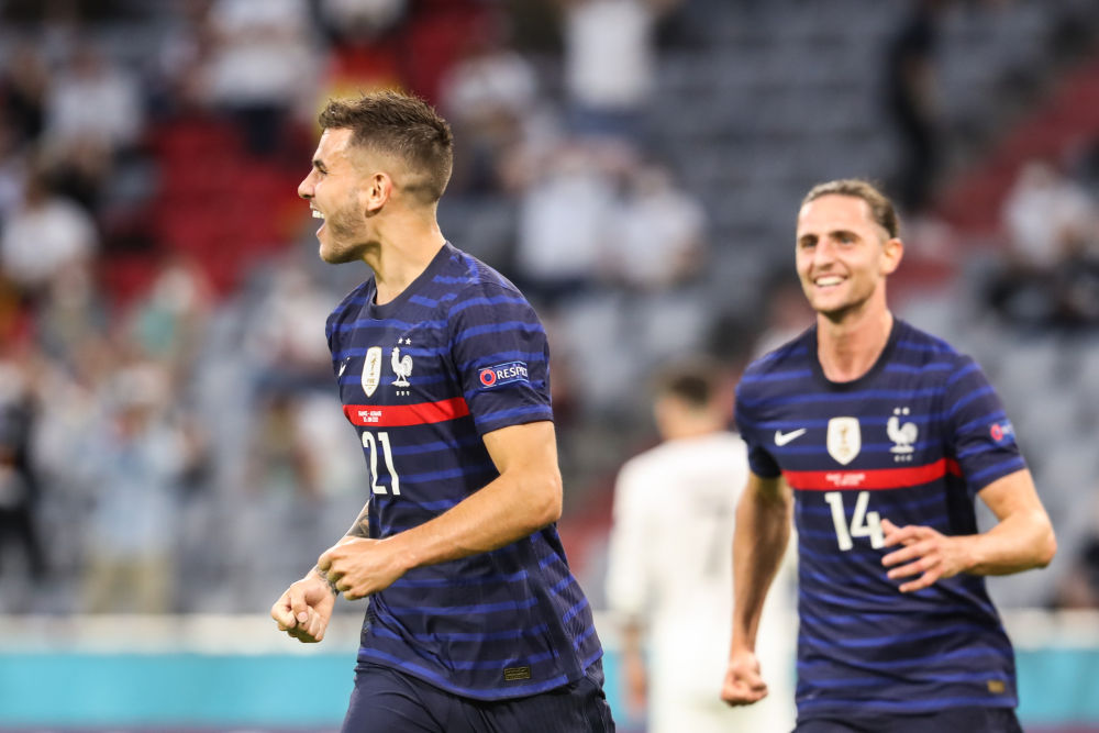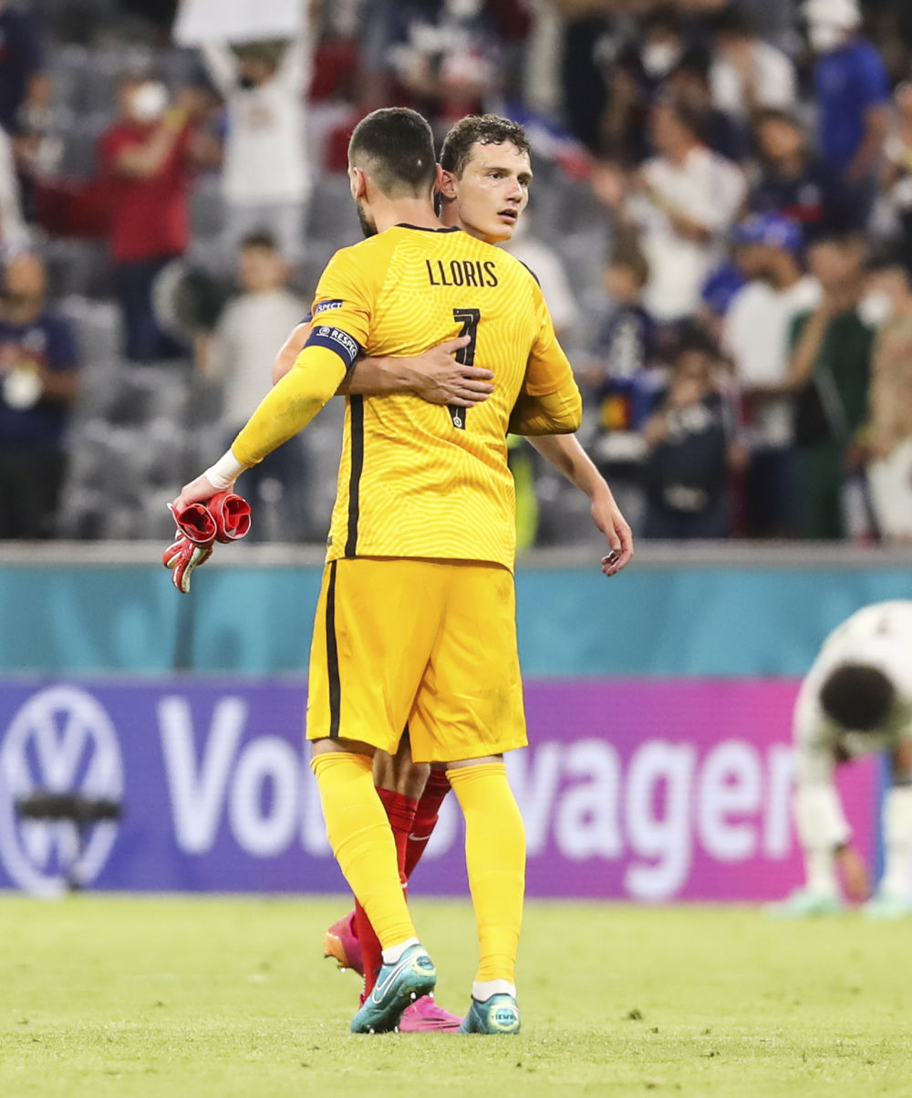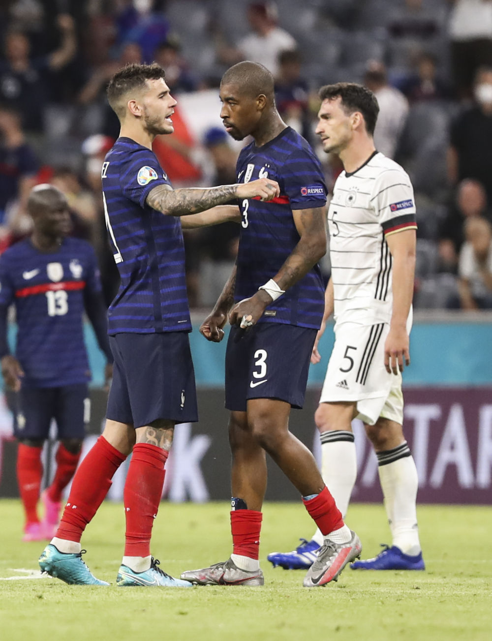 ⬆️法国队球员卢卡斯·埃尔南德斯(左)在德国队打进乌龙球后庆祝。