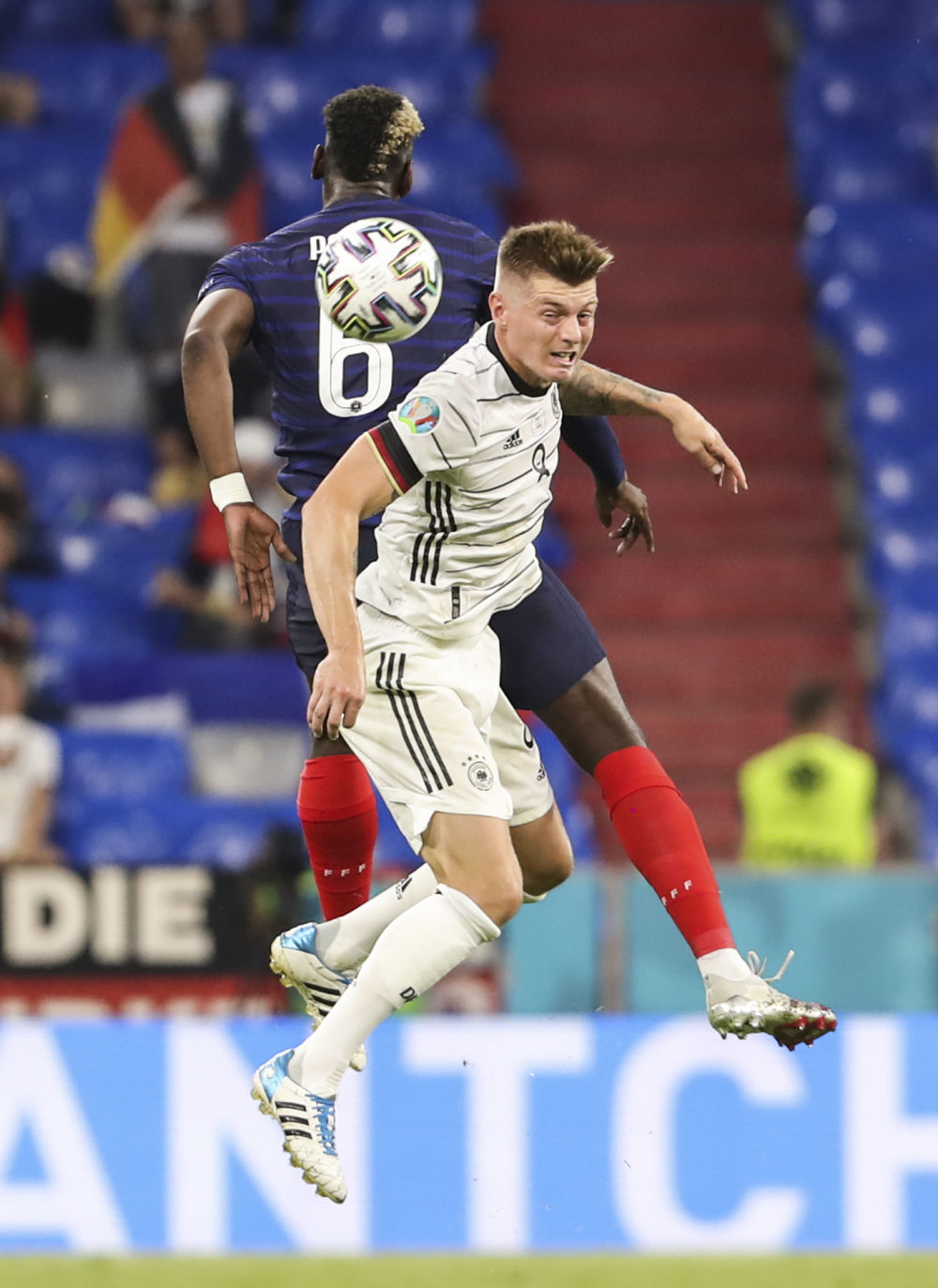 ⬆️德国队球员克罗斯(下)与法国队球员博格巴在比赛中争顶。