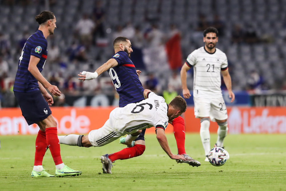 ⬆️法国队球员本泽马(上中)与德国队球员基米希(下)在比赛中拼抢。