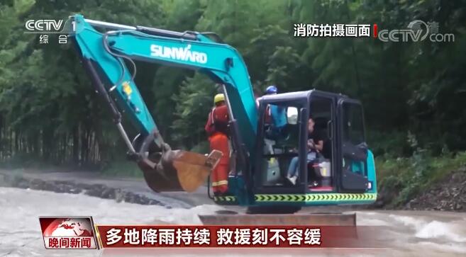 近期,安徽宣城接连出现强降雨天气。13日下午,宣城市华阳四合村附近洪水淹没道路,有车辆和人员被困在山林道路中。接到报警后,消防员立即赶往现场救援。消防员到达现场后,水已经漫过了桥面,且水位还在不断上涨,因山洪凶猛,救援车辆无法通行,消防员立即调来一辆挖掘机协助救援。由于水下道路情况不明,消防员在高处指引挖掘机前行,挖掘机边走边试探,最终成功抵达被困人员位置。消防员为被困人员穿好救生衣,做好防护后将被困人员转移到安全地带。
