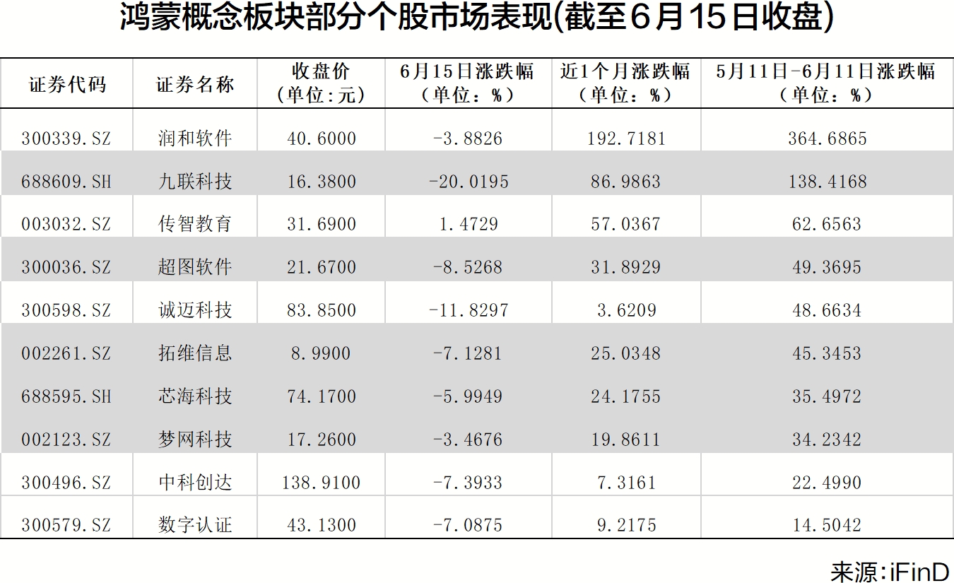 新华社北京6月16日电(记者李静)鸿蒙概念板块开始降温。6月15日,同花顺鸿蒙概念板块跌幅居首,收跌6.52%。个股方面,仅有传智教育微涨1.47%,其余个股纷纷下跌,九联科技跌停,润和软件收跌3.88%,诚迈科技收跌11.83%。