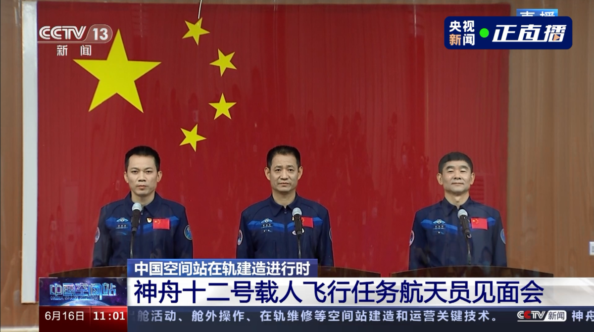 6月16日上午11时许,即将执行神舟十二号载人飞行任务的三名航天员聂海胜、刘伯明、汤洪波与中外记者见面。三名航天员身穿航天服,精神抖擞,向中外记者挥手致意,并回答了记者的提问。