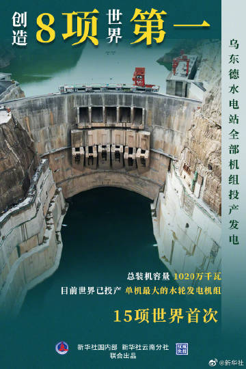 【#权威快报#|#乌东德水电站全部机组投产发电#】6月16日,金沙江乌东德水电站最后一台机组顺利完成72小时试运行,成功并入南方电网,正式投产发电。至此,乌东德水电站12台85万千瓦机组全部投产发电。乌东德水电站安装了目前世界已投产单机最大的水轮发电机组,总装机容量1020万千瓦,多年平均发电量389.1亿千瓦时。乌东德水电站位于云南省昆明市禄劝县和四川省凉山州会东县交界的金沙江河道上,是实施“西电东送”的国家重大工程,创造了世界最薄300米级特高拱坝等8项“世界第一”,创下全坝采用低热水泥混凝土等15项“世界首次”。(记者侯雪静、浦超,海报设计张晨光)