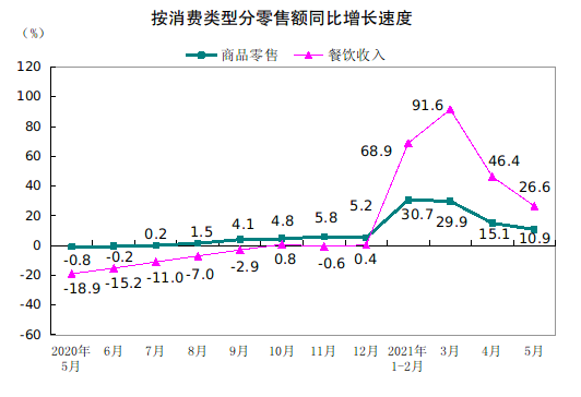 按消费类型分,5月份,商品零售32129亿元,同比增长10.9%,两年平均增长4.9%;餐饮收入3816亿元,增长26.6%,两年平均增长1.4%。1—5月份,商品零售156529亿元,同比增长22.9%,两年平均增长4.8%;餐饮收入17789亿元,增长56.8%,两年平均下降0.3%。